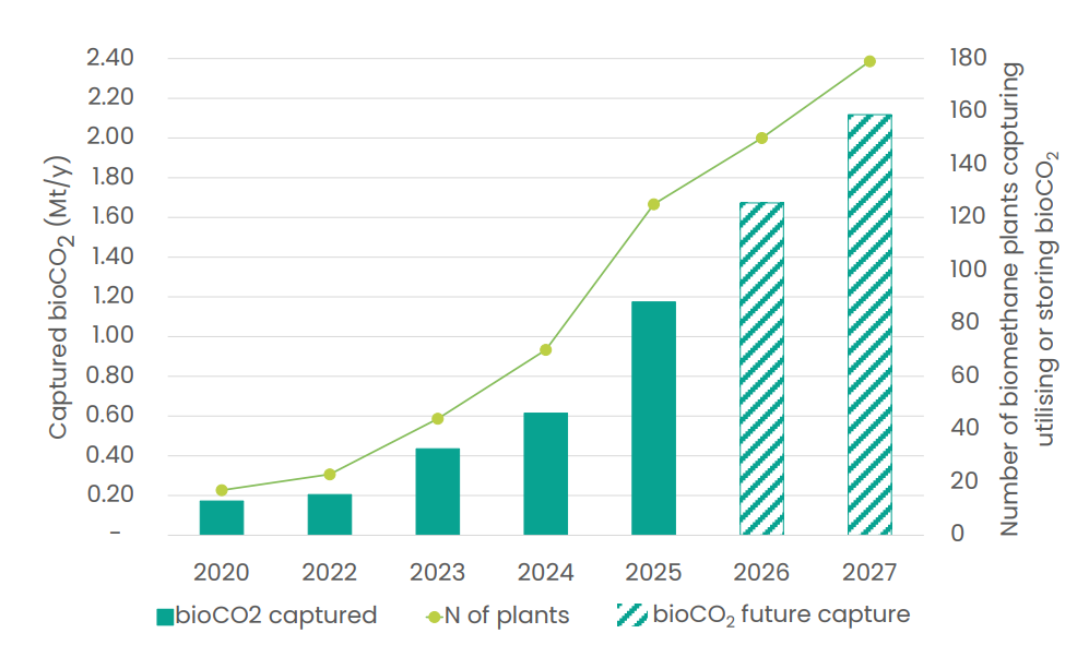The market data study shows the number of biomethane plants capturing biogenic CO2 in Europe has increased eightfold over the past five years, from 15 plants capturing 0.16 million tonnes in 2020 to 125 plants capturing 1.17 million tonnes in 2025, equivalent to around 14% of Europe’s merchant liquid and solid CO2 demand.